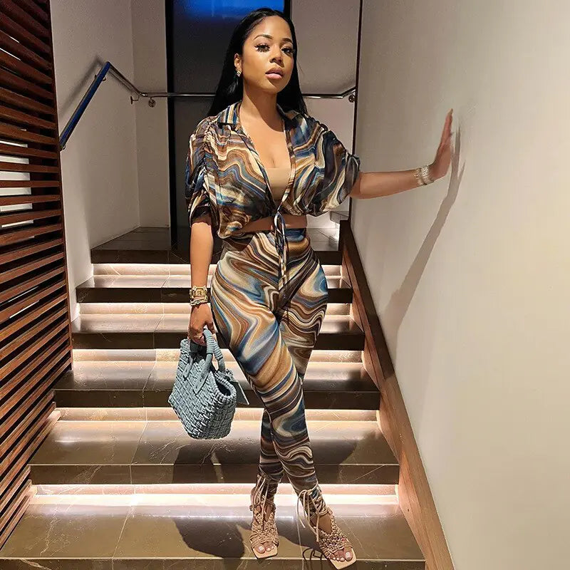 2 Piece Set Abstract Print Sheer Mesh Outfits