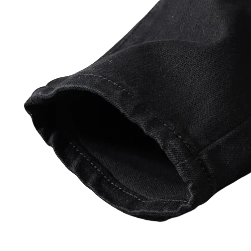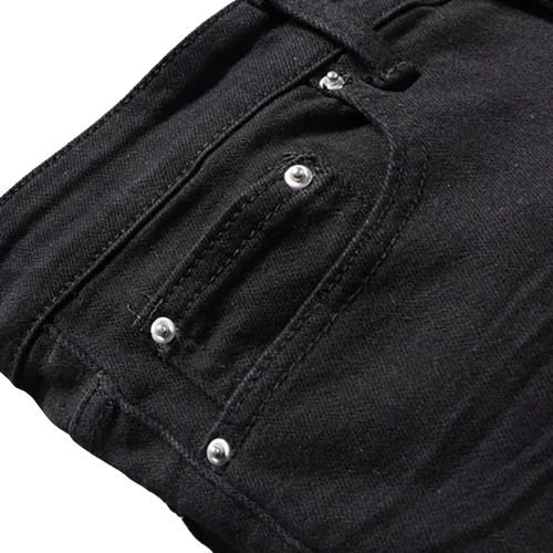 Verleihen Sie Ihrem Ensemble mit den Black Biker Ripped Jeans sofort einen coolen Look. Ihre vielseitige schwarze Farbe und die Used-Details machen sie zu einem Must-have für jeden modebewussten Menschen. Egal, ob Sie auf der Straße unterwegs sind oder mit Freunden abhängen, diese Jeans bieten mühelosen Stil und Haltung.