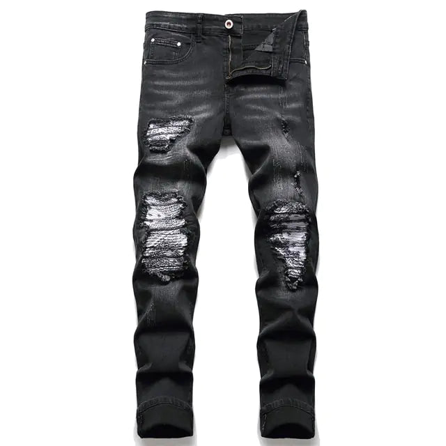 Reiten Sie auf der Welle des Stils mit Herrenjeans mit Paisley-Bandana-Print-Patch. Setzen Sie ein Statement mit einzigartigem Patchwork-Design