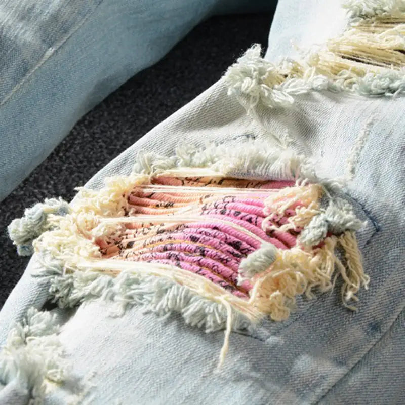 Werten Sie Ihre Alltagsoutfits mit Pink Patch Ripped Jeans auf. Ob Sie sie mit einem einfachen T-Shirt für einen lässigen Look kombinieren oder mit einer schicken Bluse und High Heels aufpeppen, diese Jeans verleihen jedem Ensemble einen trendigen und modischen Touch.