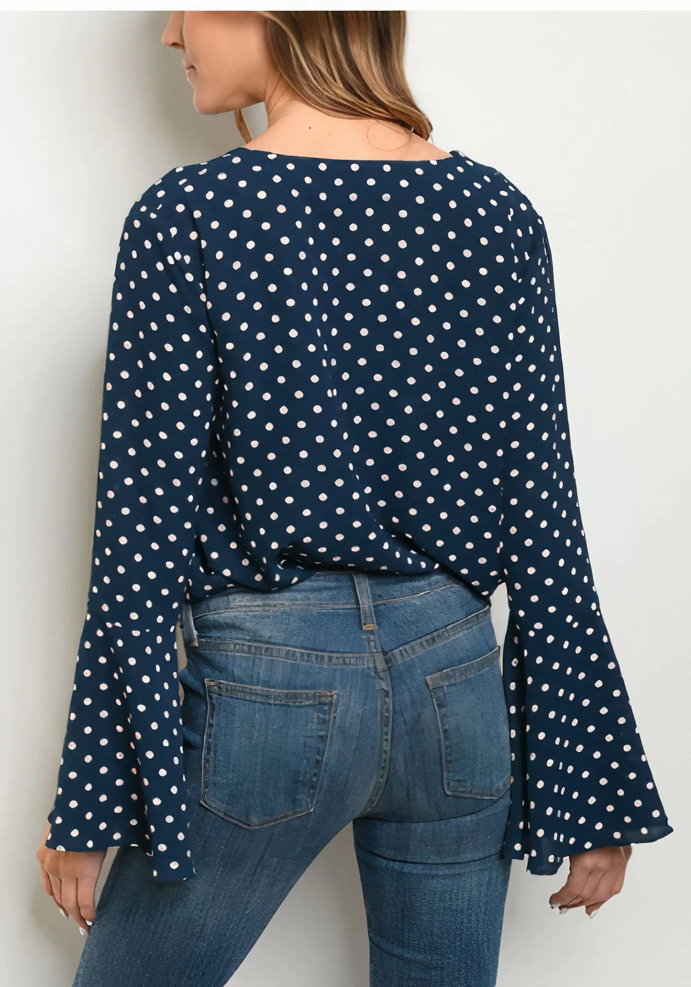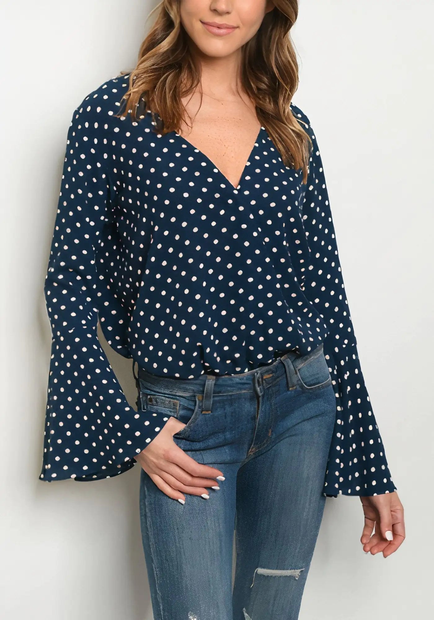 Body de lunares con escote en V y manga larga acampanada.