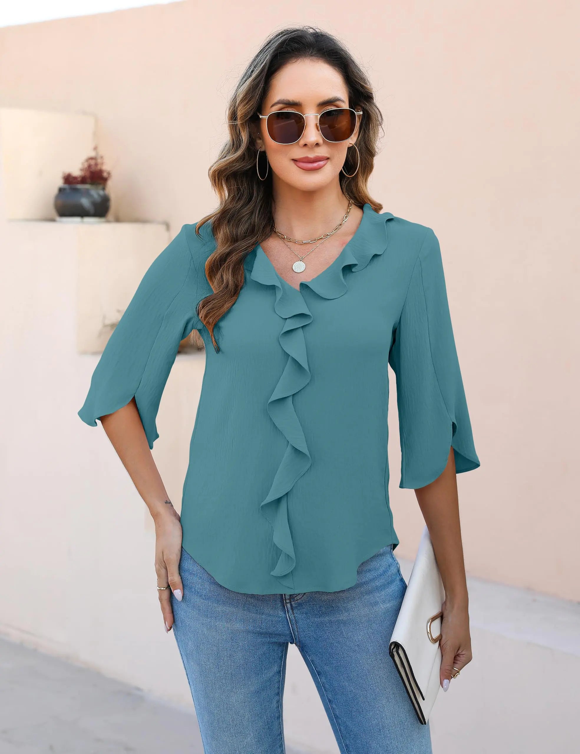 Blusas elegantes e informales para mujer Blooming Jelly, blusas con cuello en V y mangas 3/4 con volantes, camisas de trabajo de moda para mujer de negocios, verano 2024, talla estándar, verde azulado extragrande