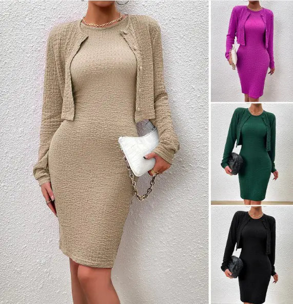 Elevate your wardrobe with the Women's Stylish Temperament Long Sleeves Top Round Neck Sheath Dress Suit. A perfect blend of sophistication and modern design, this ensemble features a long-sleeve top with a round neck, paired with a sheath dress for a sleek, tailored look. Whether for professional settings, evening events, or casual outings, this suit exudes elegance and confidence. Its versatile design makes it a must-have addition to any woman's collection, offering a flattering silhouette and a timeless appeal.