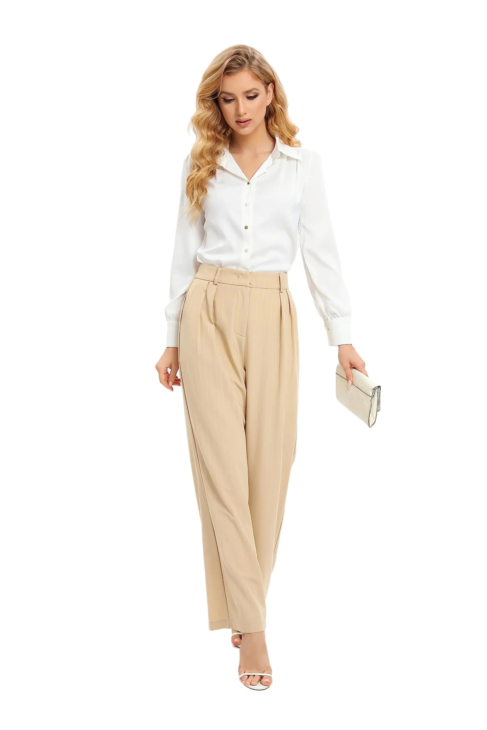 Pantalones de oficina para mujer, de cintura alta, anchos, holgados, con cintura elástica, plisados en la parte delantera, para el trabajo informal