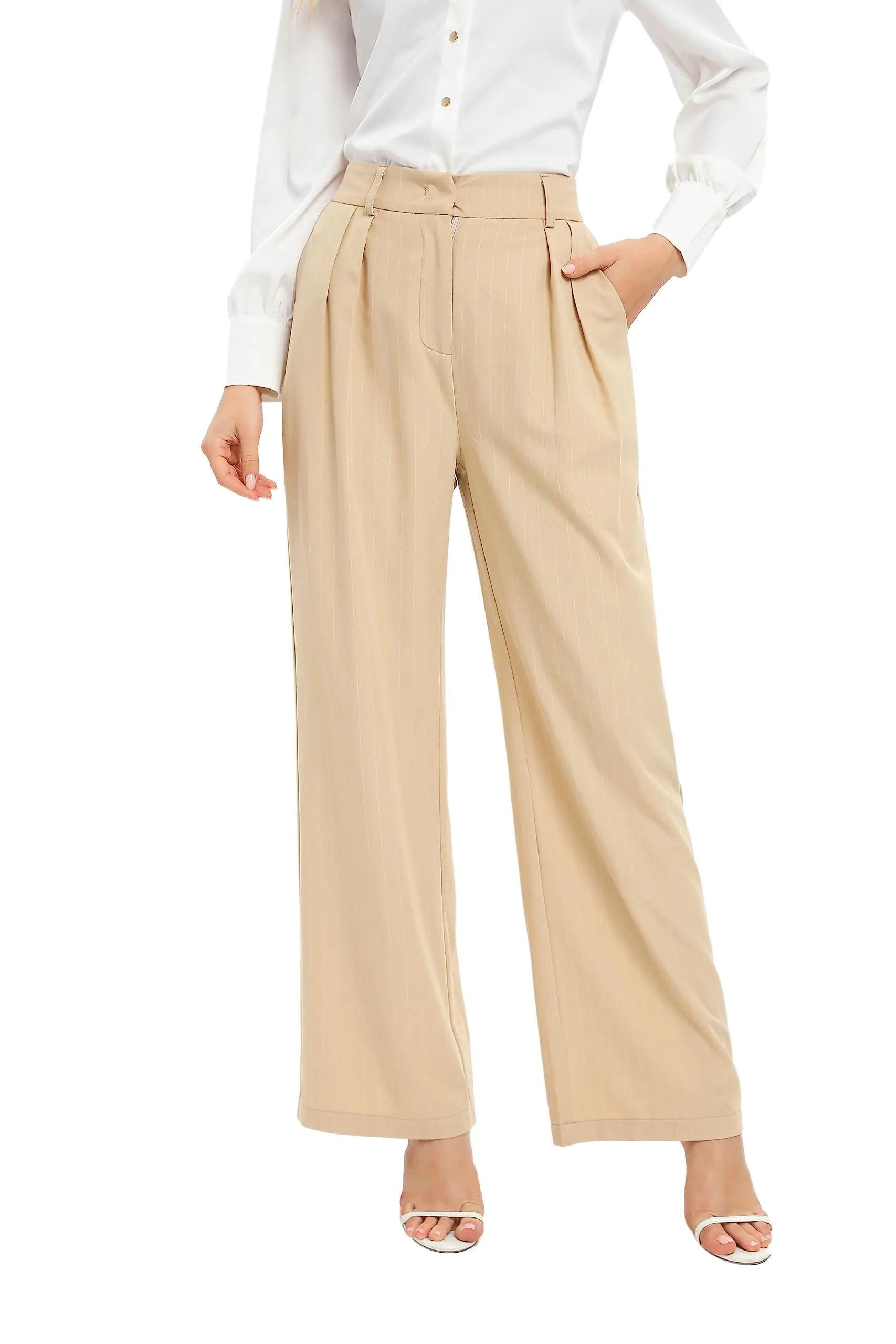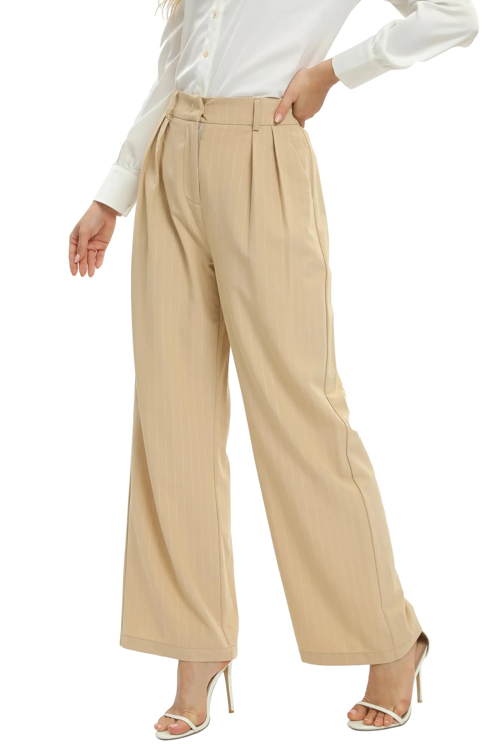 Pantalones de oficina para mujer, de cintura alta, anchos, holgados, con cintura elástica, plisados en la parte delantera, para el trabajo, informales, color albaricoque pequeño (raya)