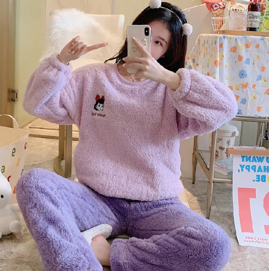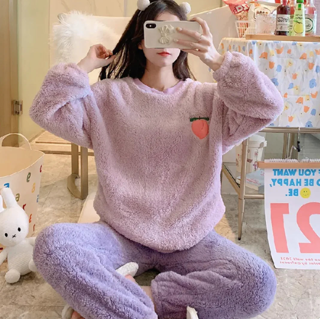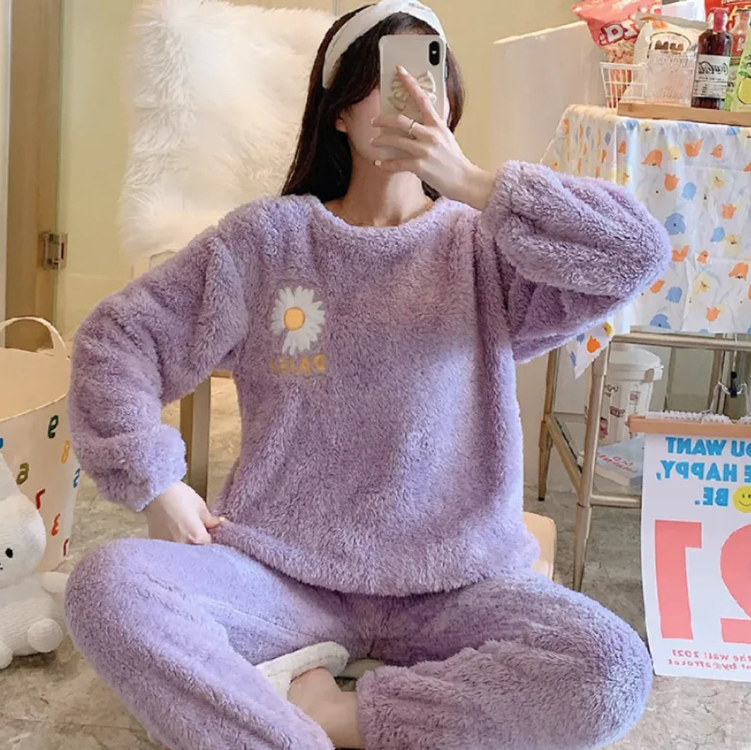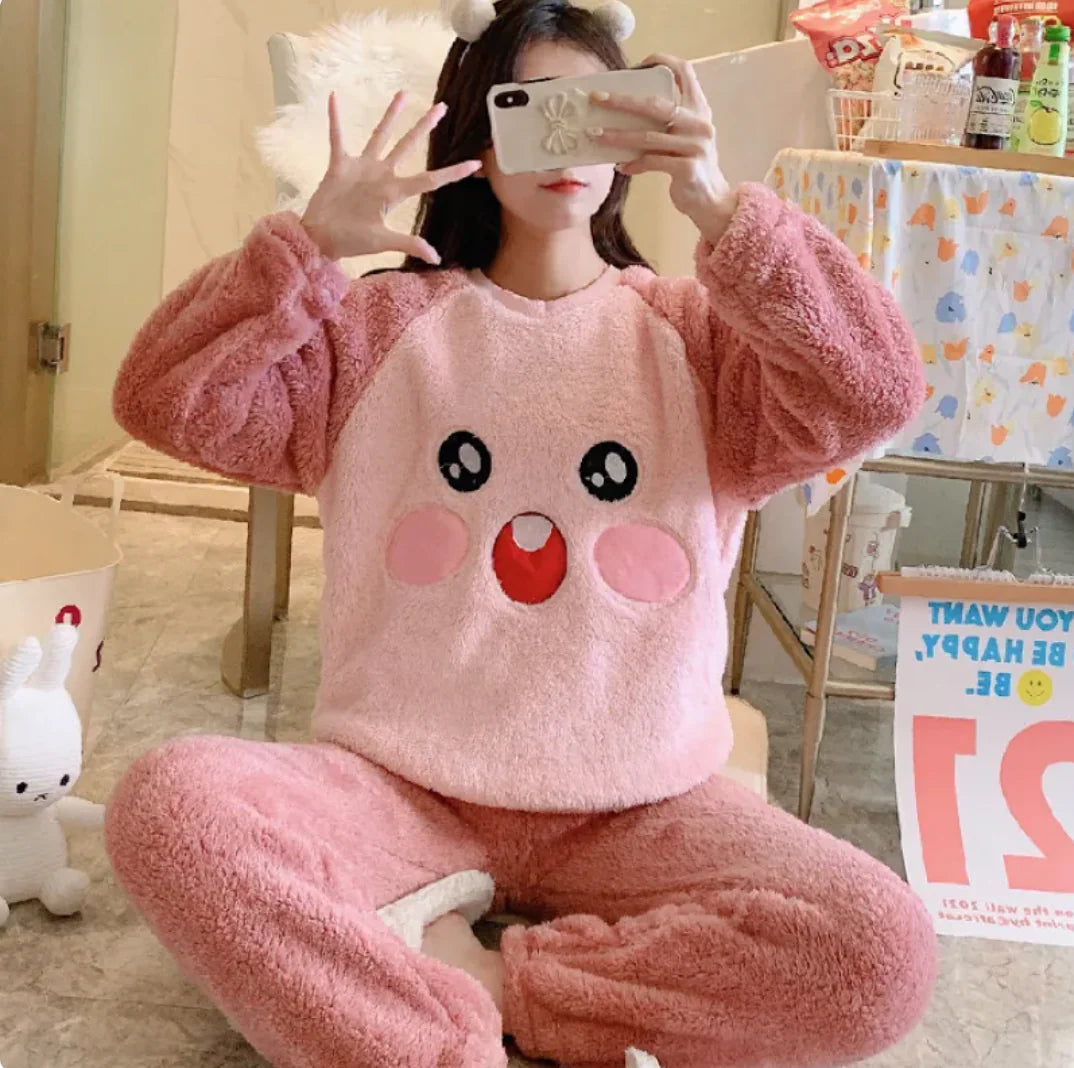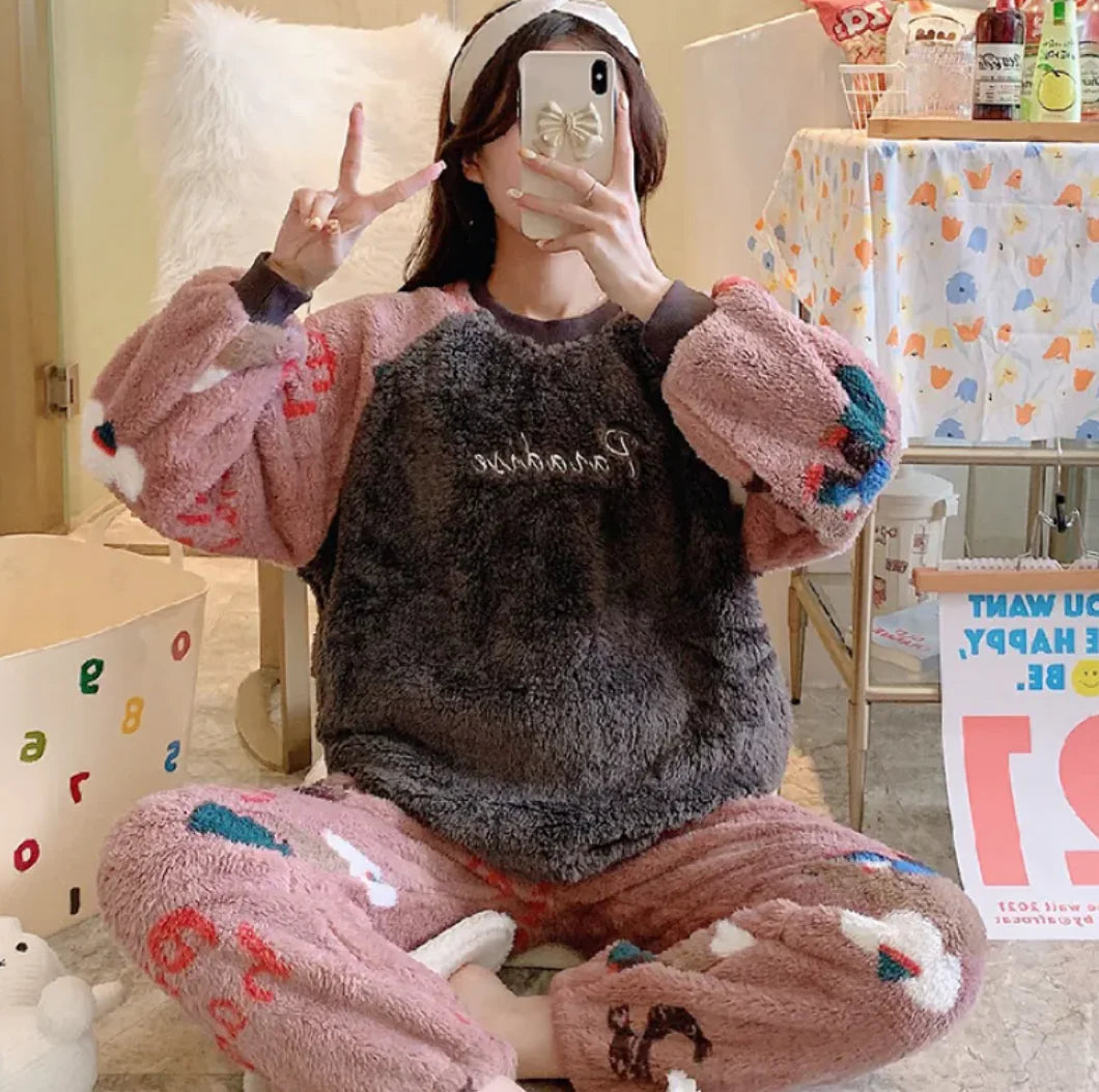 Adorable pijama de polar coral para estar en casa con un interior forrado con polar grueso para una máxima calidez. Presenta un diseño dulce y tierno, perfecto para descansar cómodamente en otoño e invierno.