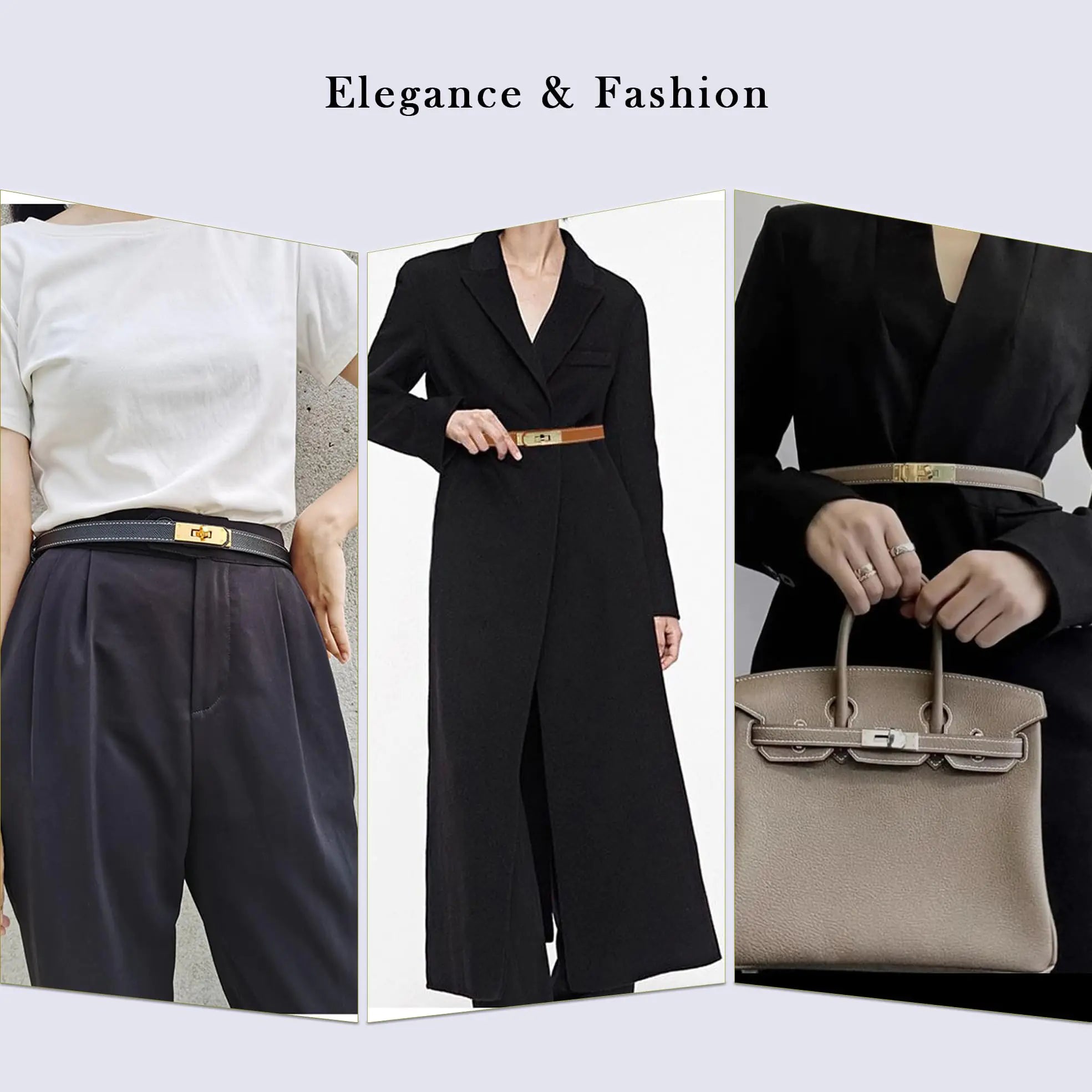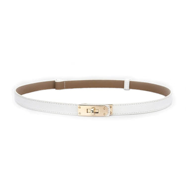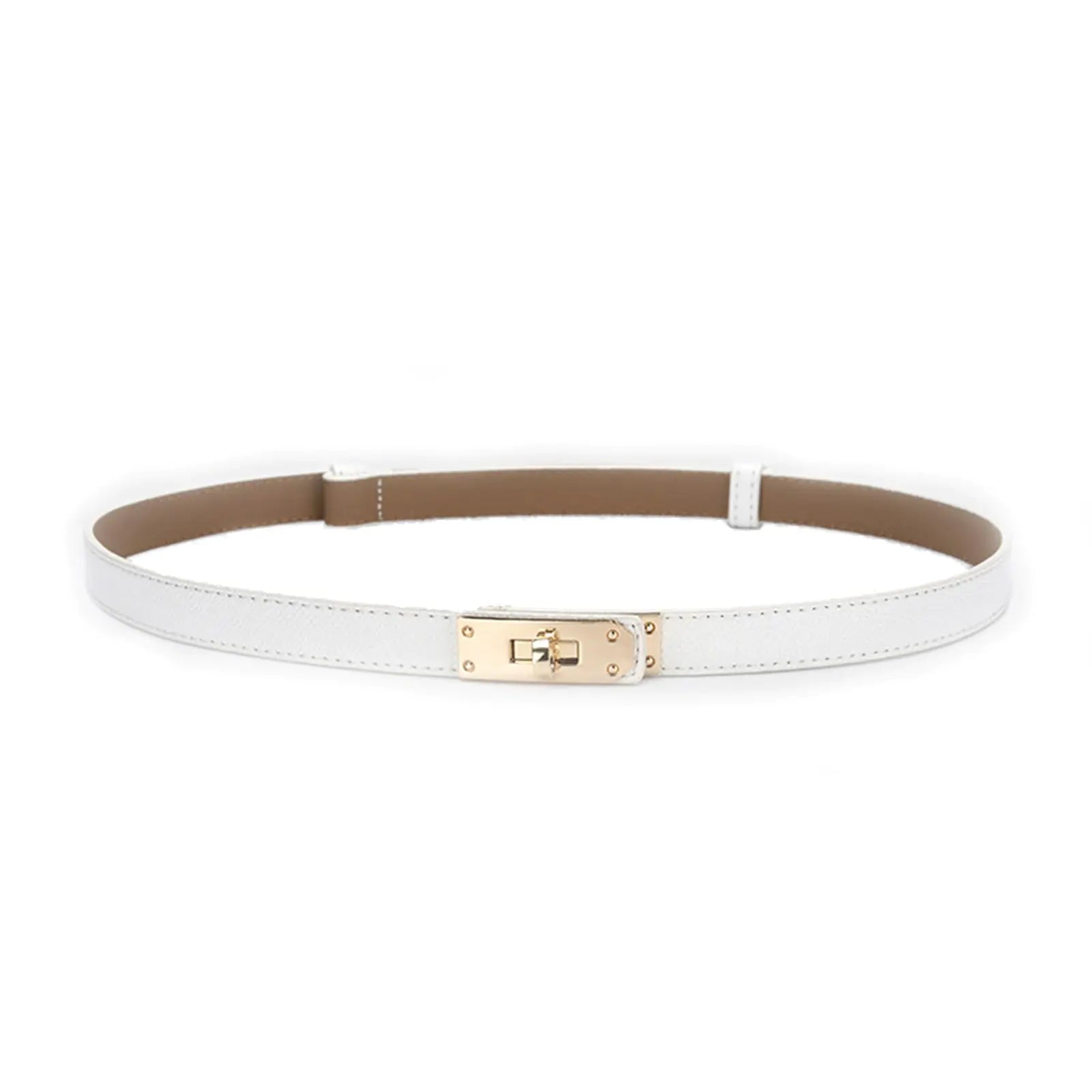 Cinturón de cuero fino para mujer con hebilla ajustable con cierre giratorio plateado, ideal para vestidos, jeans y abrigos, negro, blanco y dorado
