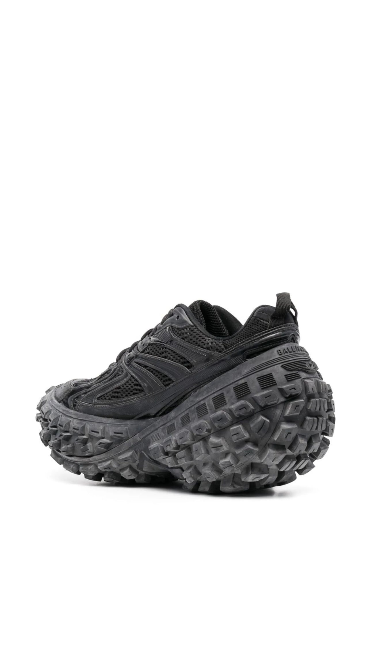 Balenciaga's Bouncer sneakers made their label debut during the brand's SS22 runway show. Seen here in a tonal black hue, the sneakers sit atop an extended rubber outsole that takes inspiration from tires with its distinctive tread.