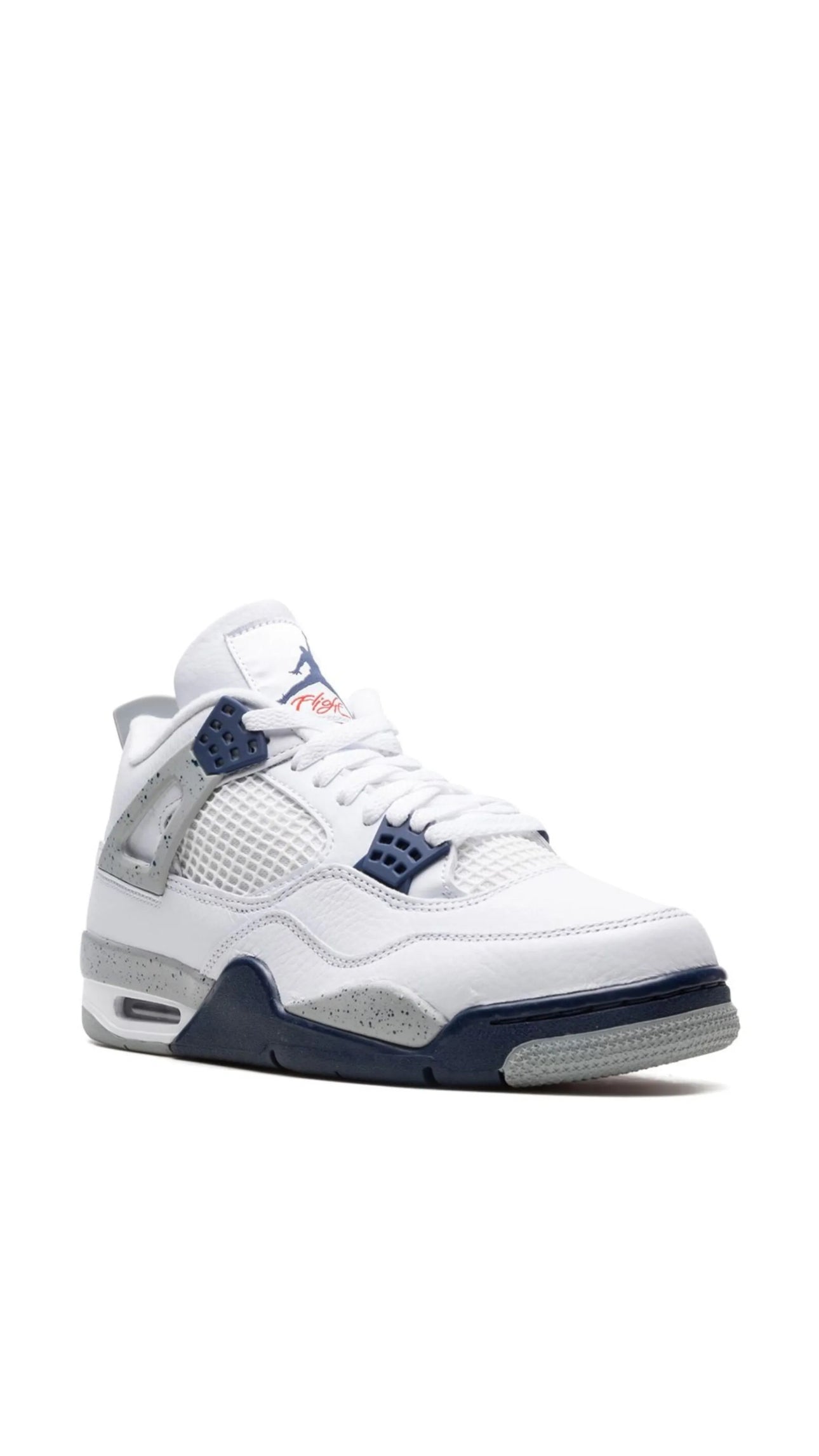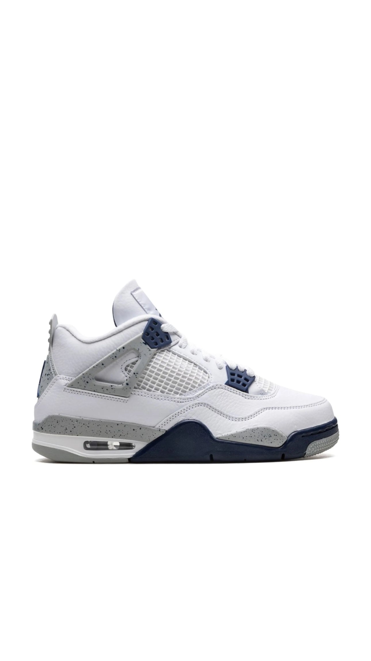 A basketball silhouette, the Air Jordan 4 'Midnight Navy' sneakers pair contemporary with old-school aesthetics. Presented here in a white, navy and grey colourway, they're detailed with mesh panelling and supported with signature Air cushioning underfoot.